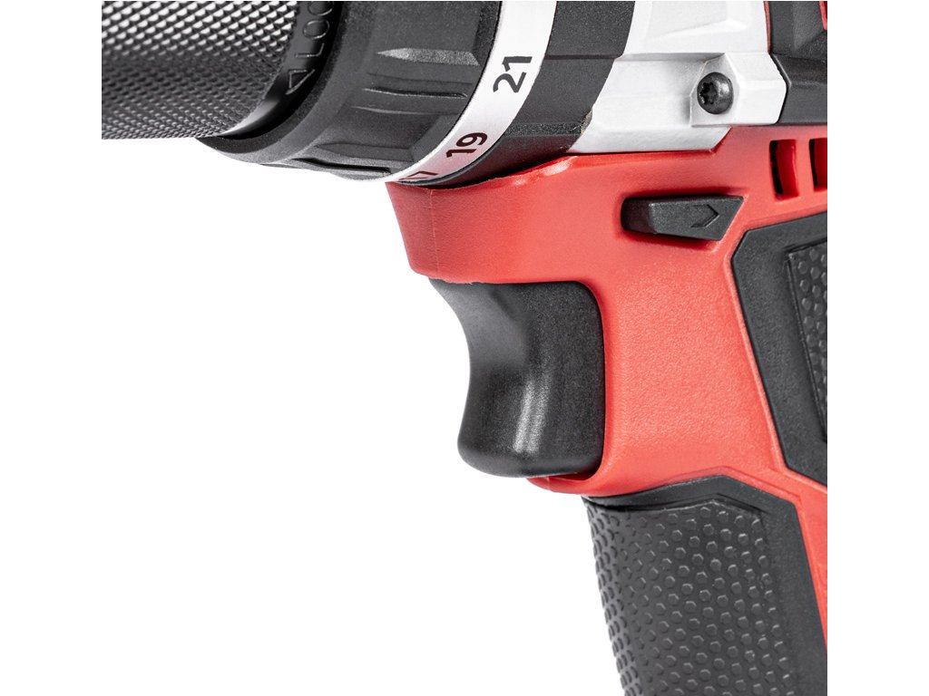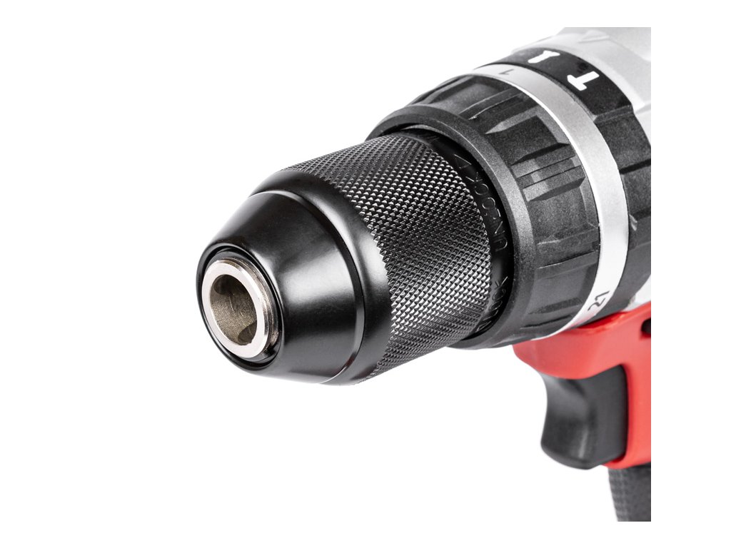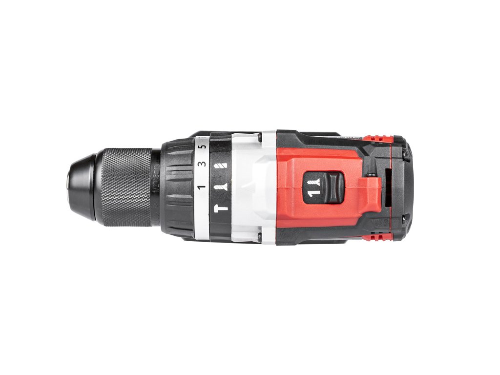 Výkonná a kompaktní aku vrtačka s příklepem, dvěma akumulátory, nabíječkou a příslušenstvím v robustním kufru. Vhodná pro vrtání, šroubování i lehké příklepové práce.