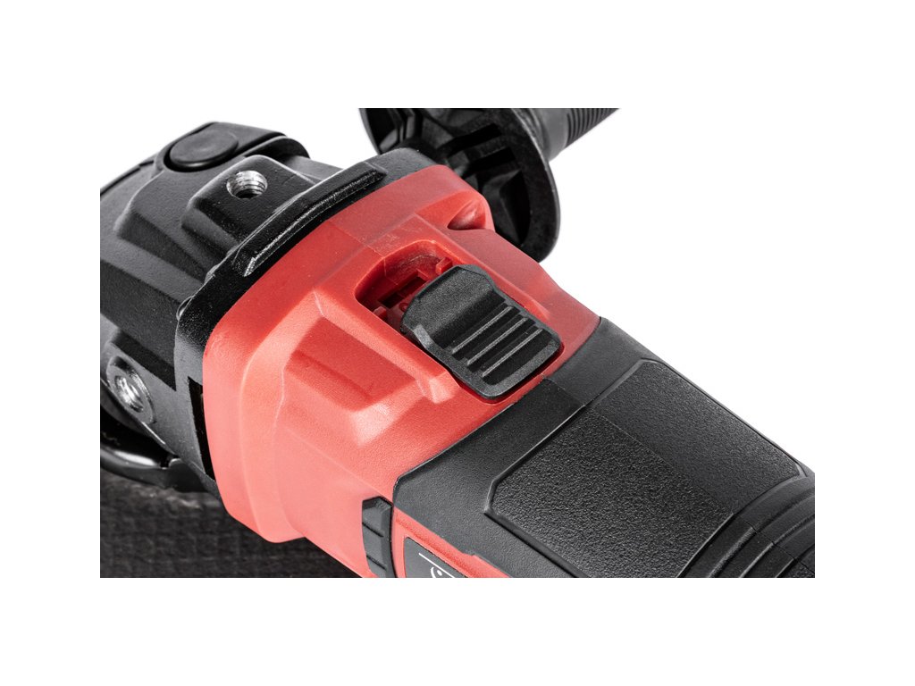 - Bruska má hliníkové převodové pouzdro, které zajišťuje delší životnost zařízení. Díky blokaci vřetena je výměna kotouče rychlá a bezpečná. Sada je dodávána včetně baterie, nabíječky a kufru, díky čemuž je připravena k okamžitému použití.