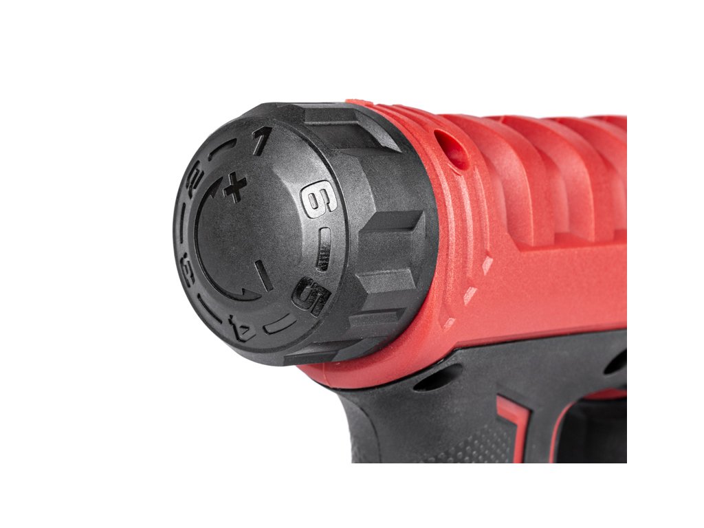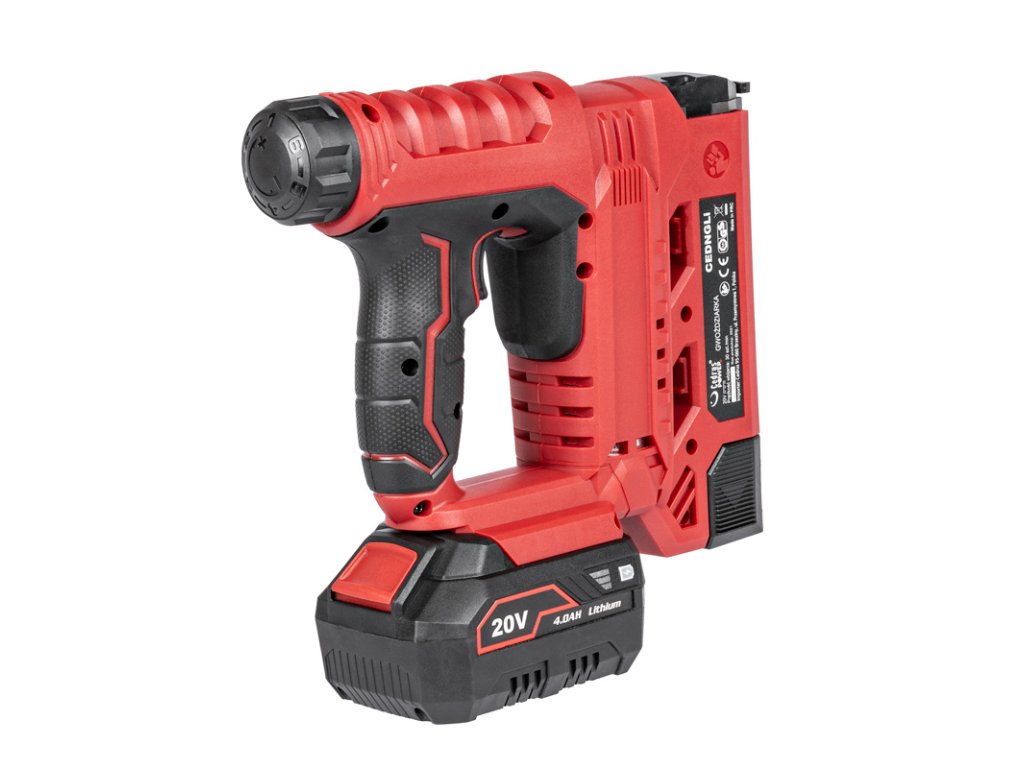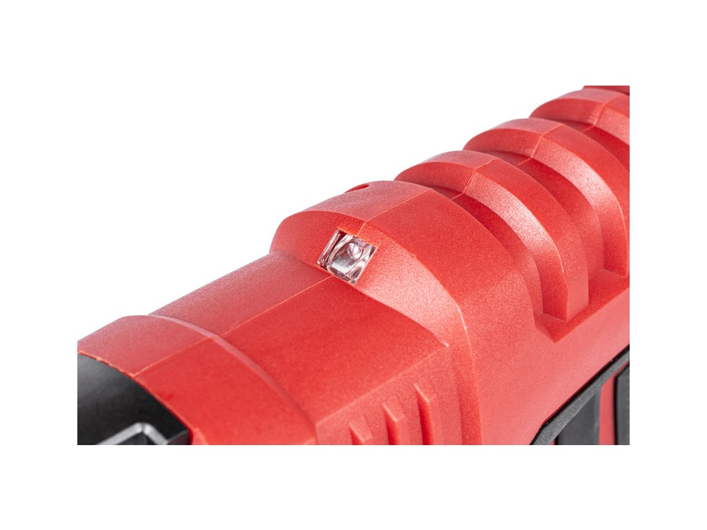 - Vybaven je měkkou rukojetí, LED pracovním světlem a indikátorem naplnění zásobníku. Samozřejmostí je ochrana proti přetížení, přehřátí i vybití baterie, což zajišťuje dlouhou životnost zařízení i bezpečné používání. Rychlou výměnu hřebíků a spon umožňuje přístupný posuvný zásobník.