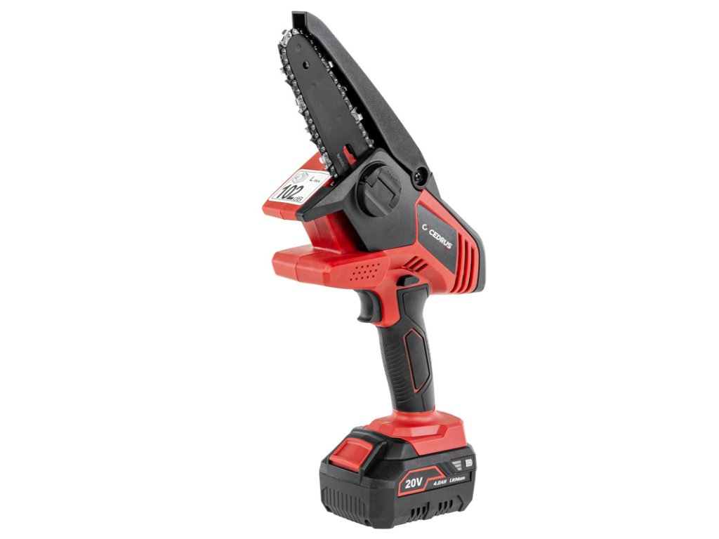 Cedrus CEDCHS100LI je kompaktní akumulátorová řetězová pila vhodná pro řezání větví a menších kusů dřeva. Díky ergonomické rukojeti a nízké hmotnosti (1,35 kg) umožňuje pohodlnou manipulaci i při dlouhodobém použití. Beznářaďový napínací systém a bezpečnostní prvky zajišťují snadnou a bezpečnou práci.
