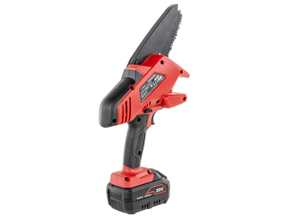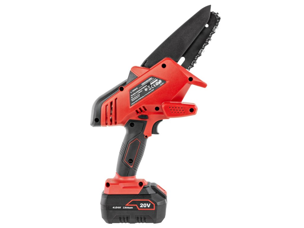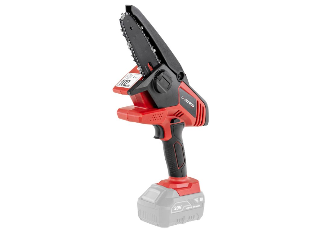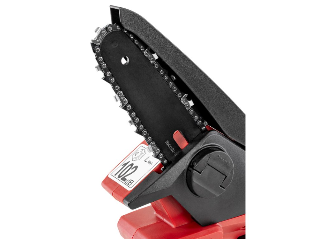 - Pila pracuje na akumulátor max 20V Li-Ion (není součástí balení) a dosahuje otáček 5400 ot./min s rychlostí řetězu 8 m/s. Ergonomický design s měkkým úchopem a bezpečnostní prvky, jako ochrana rukou a nízkoodrazový řetěz, zvyšují bezpečnost uživatele.
