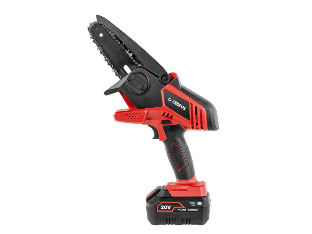 Akumulátorová mini pilka Cedrus CEDCHS100LI je ideálním pomocníkem pro zahradní a hobby práce. Je vybavena 10cm dlouhou lištou a řetězem 1/4", což umožňuje efektivní řezání menších větví a dřeva. Díky beznářaďovému napínání řetězu je údržba snadná a rychlá.