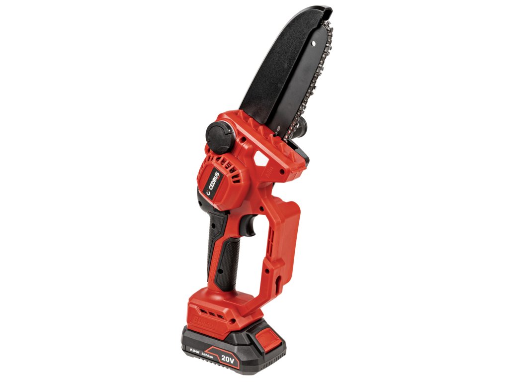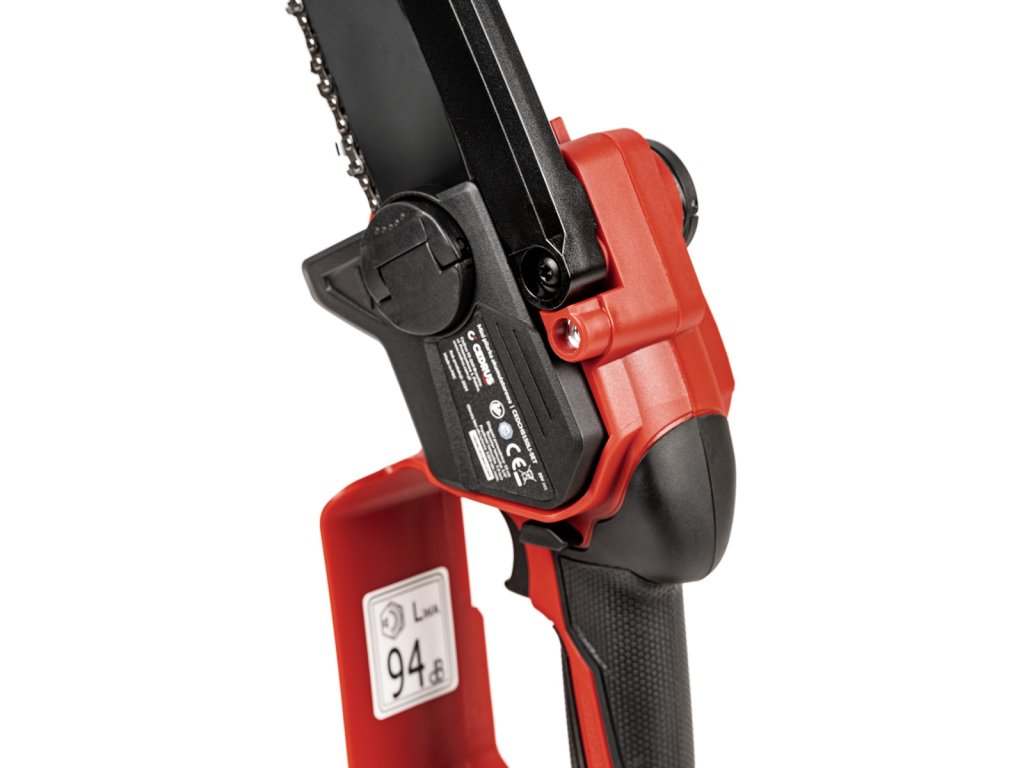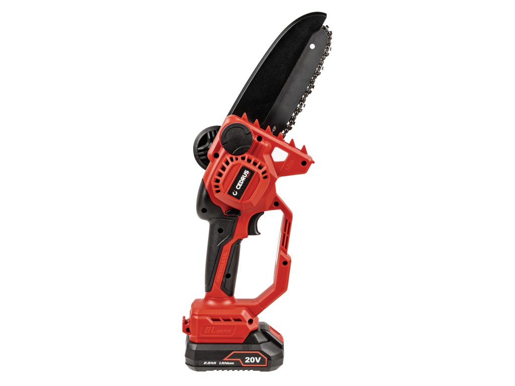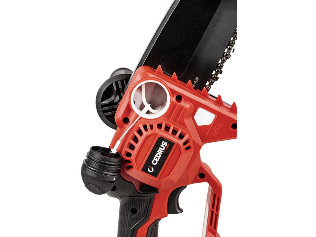 Kompaktní mini řetězová pila Cedrus s 15cm lištou, beznástrojovým napínáním řetězu a automatickým mazáním. Součástí je baterie 2 Ah a nabíječka 2,4 A.