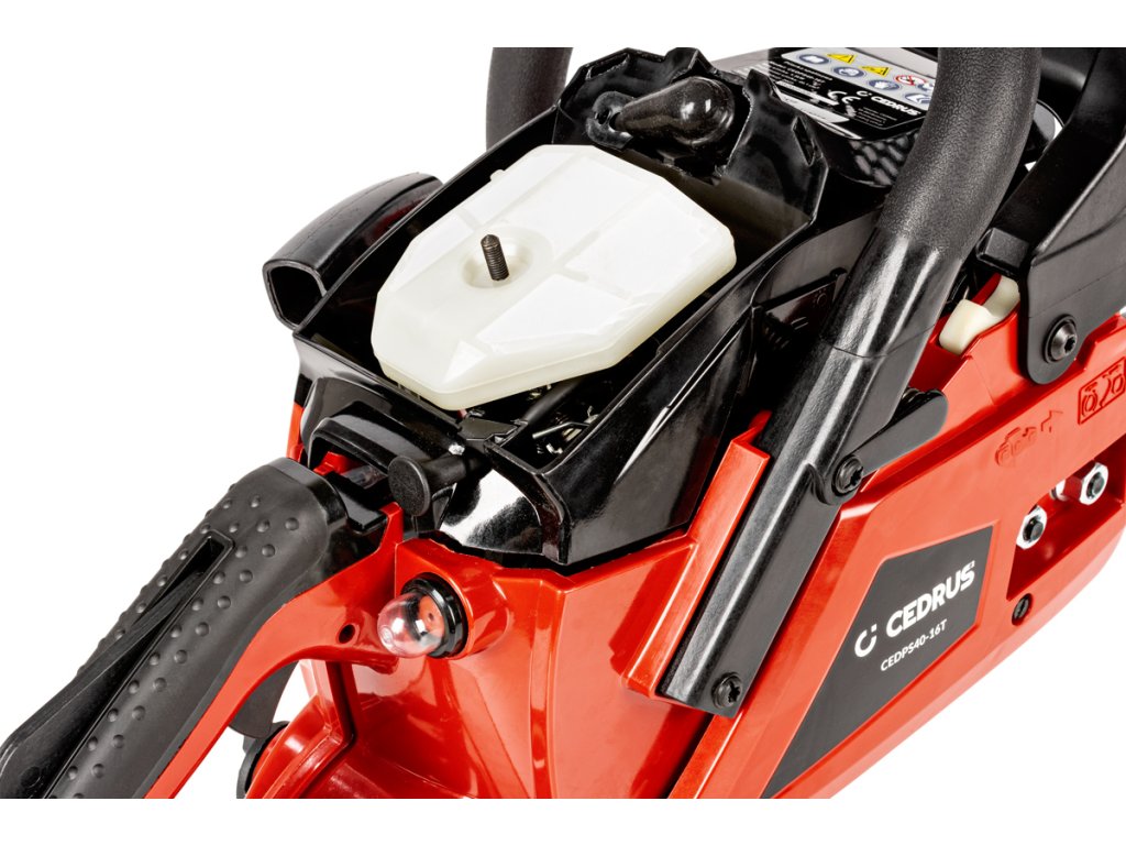 - Díky nádrži na palivo o objemu 310 ml a nádrži na olej o objemu 210 ml lze pracovat po delší dobu bez nutnosti častého doplňování. Pilu lze snadno startovat pomocí primeru a manuálního startéru.