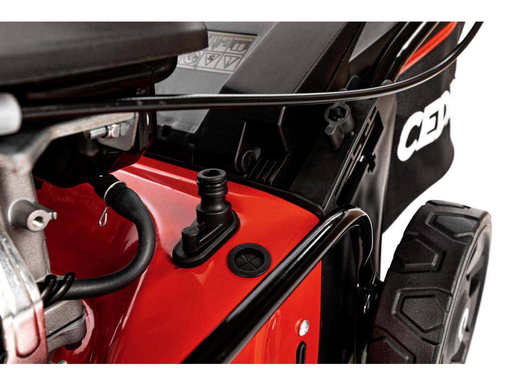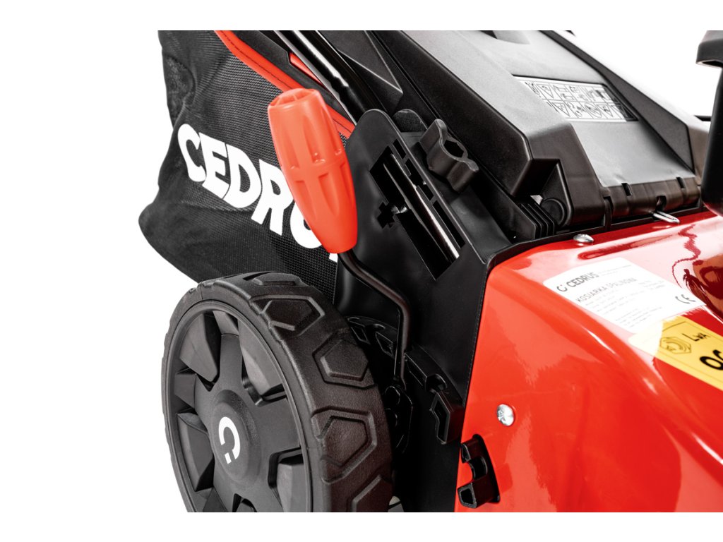 - Díky kombinovanému sběrnému koši (plast + látka) o objemu 45 litrů není nutné časté vyprazdňování. Možné jsou dvě metody sečení – sběr do koše nebo mulčování. Konstrukce je ocelová, což zaručuje dlouhou životnost a odolnost vůči mechanickému poškození.