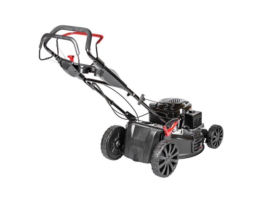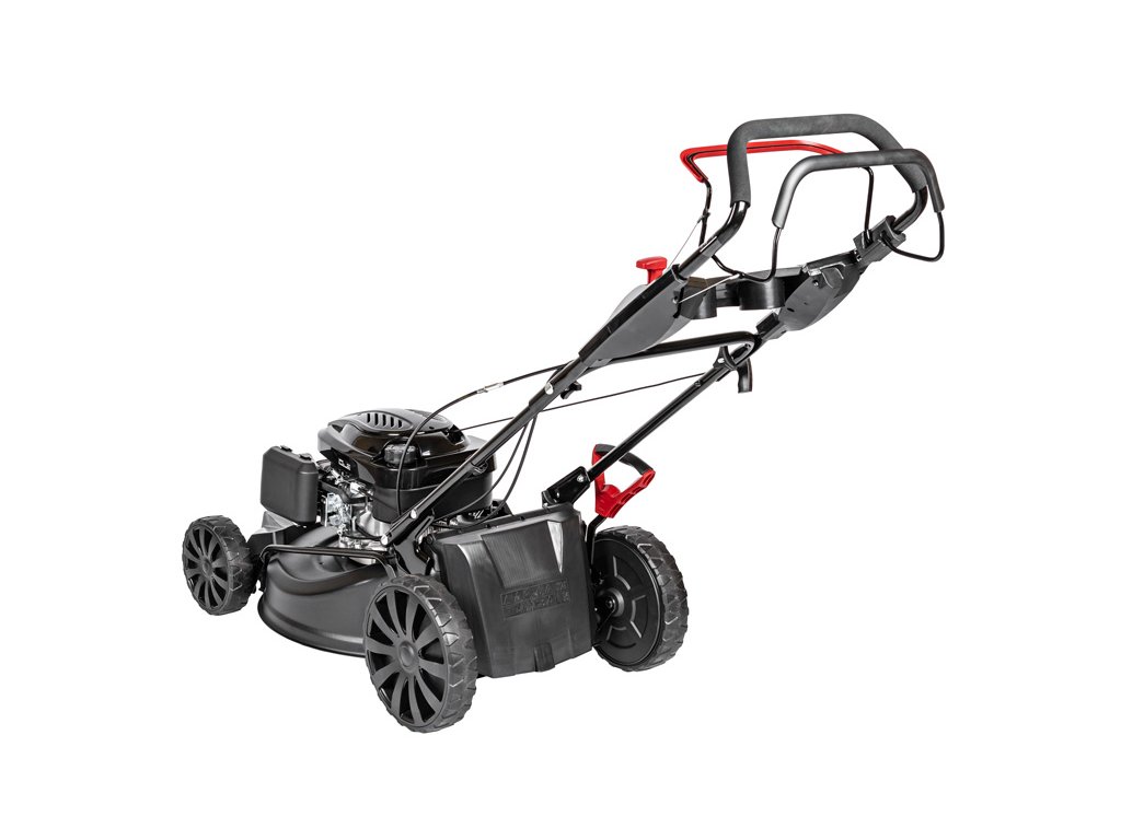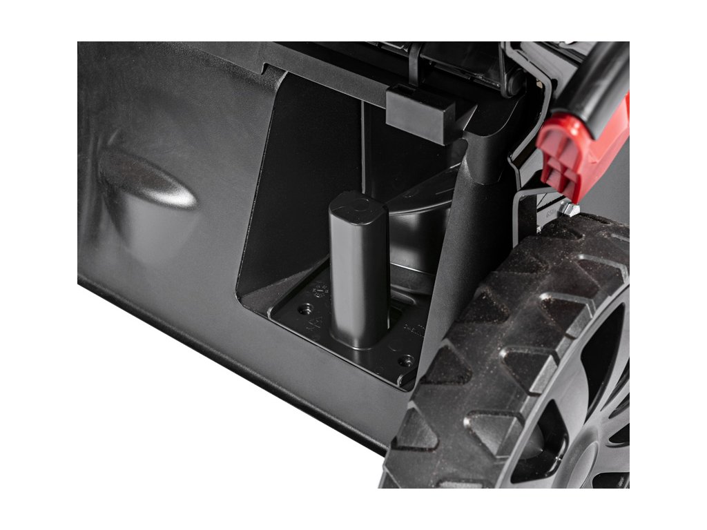 - Model nabízí 4 funkce sečení – sběr do koše, boční výhoz, mulčování a pojezd. Sběrný koš o objemu 65 litrů s indikátorem naplnění minimalizuje frekvenci vysypávání. Velká kola (20 cm vpředu, 28 cm vzadu) s ložisky zajišťují snadnou ovladatelnost i na nerovném terénu.