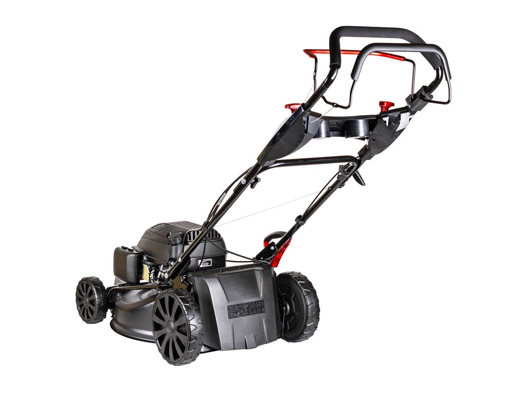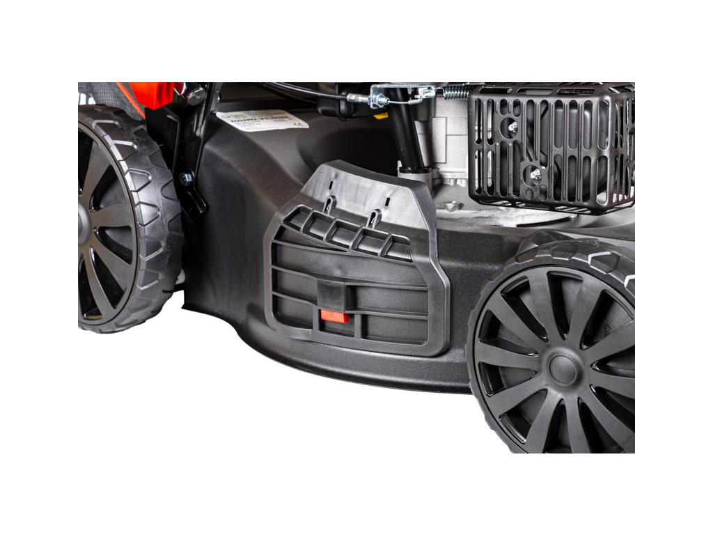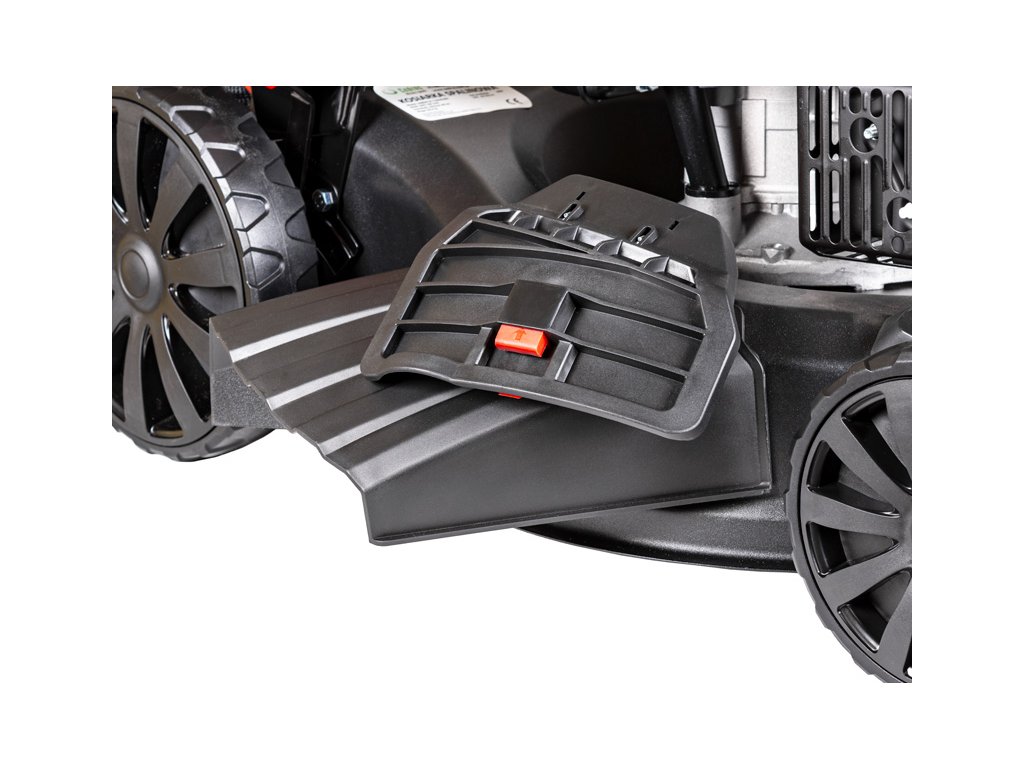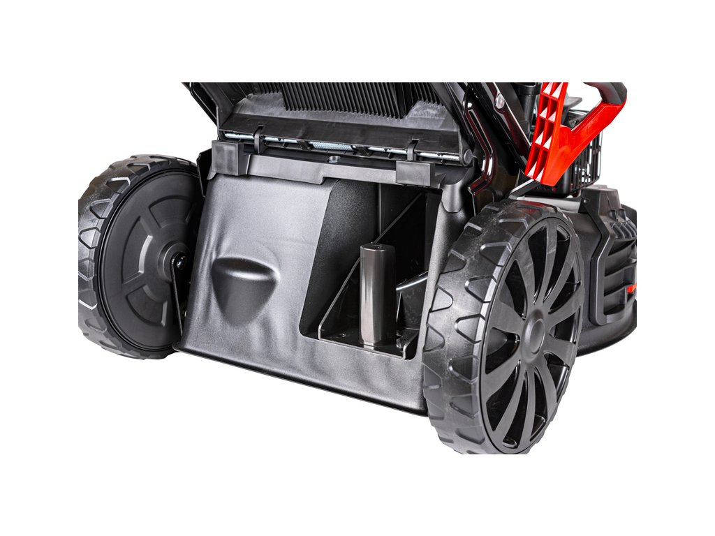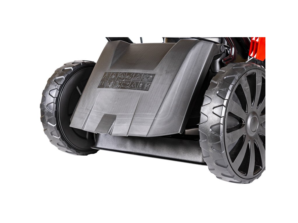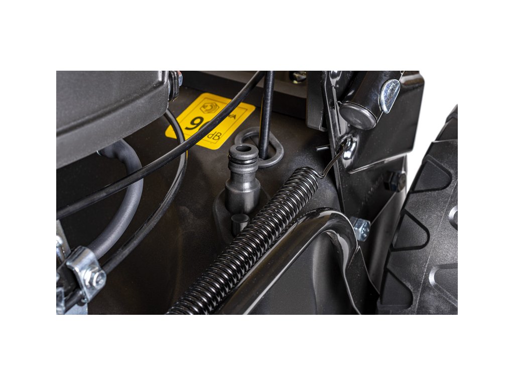 - Díky velkým zadním kolům (11”) a předním kolům (8”) poskytuje lepší stabilitu a snadnou ovladatelnost i na nerovném terénu. Přípojka pro zahradní hadici umožňuje snadné čištění po sekání, což prodlužuje životnost nožů a celého mechanismu.
