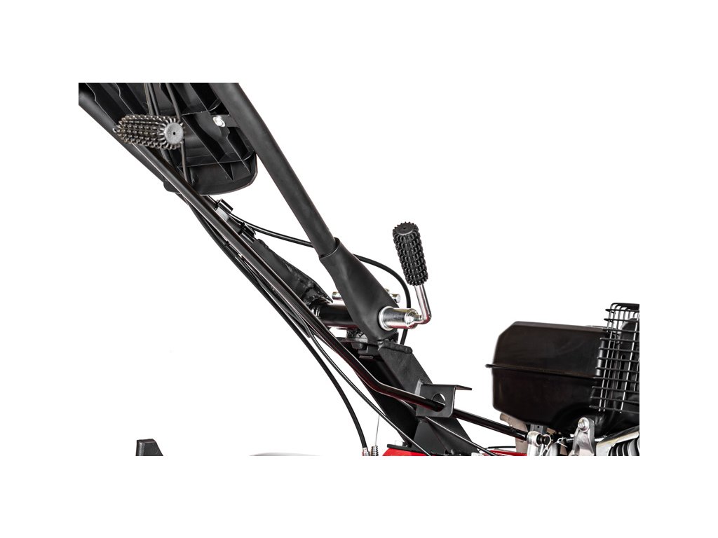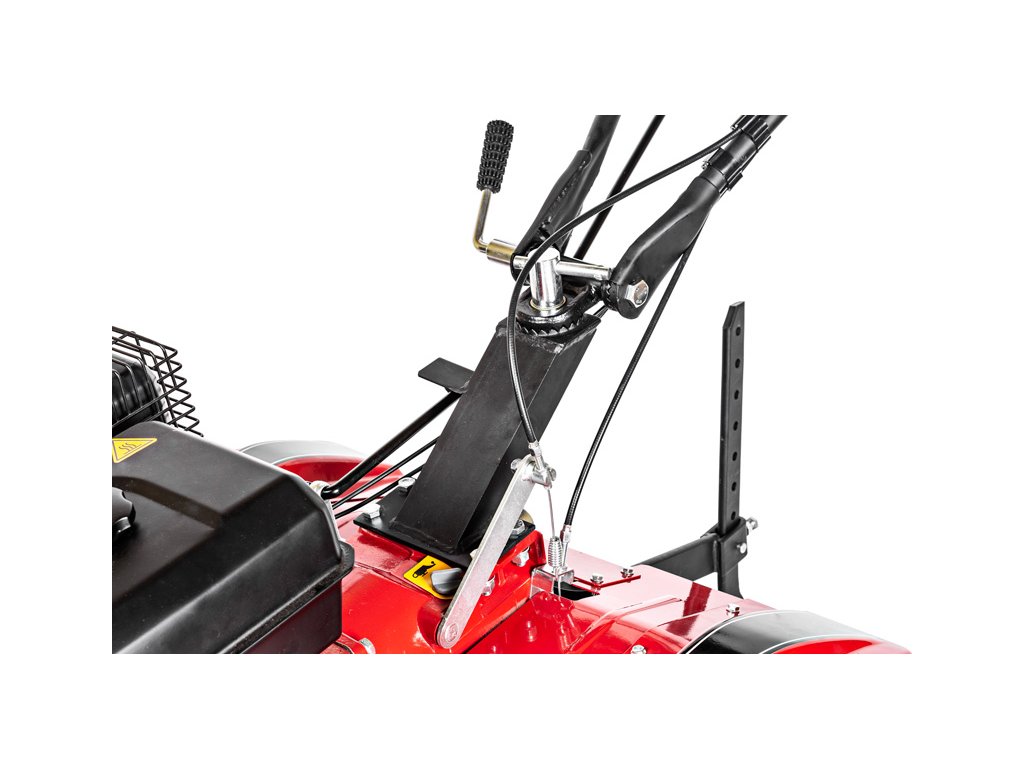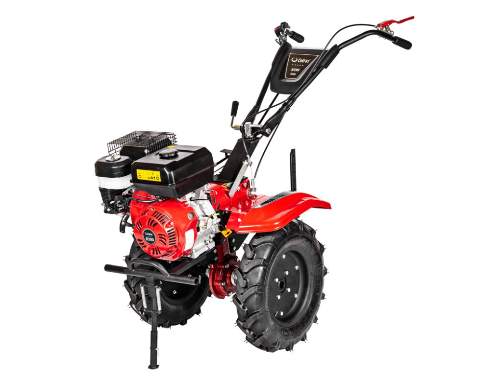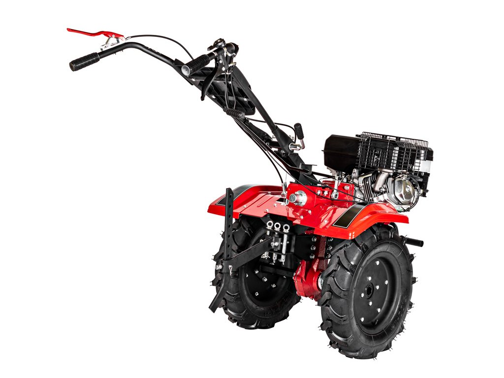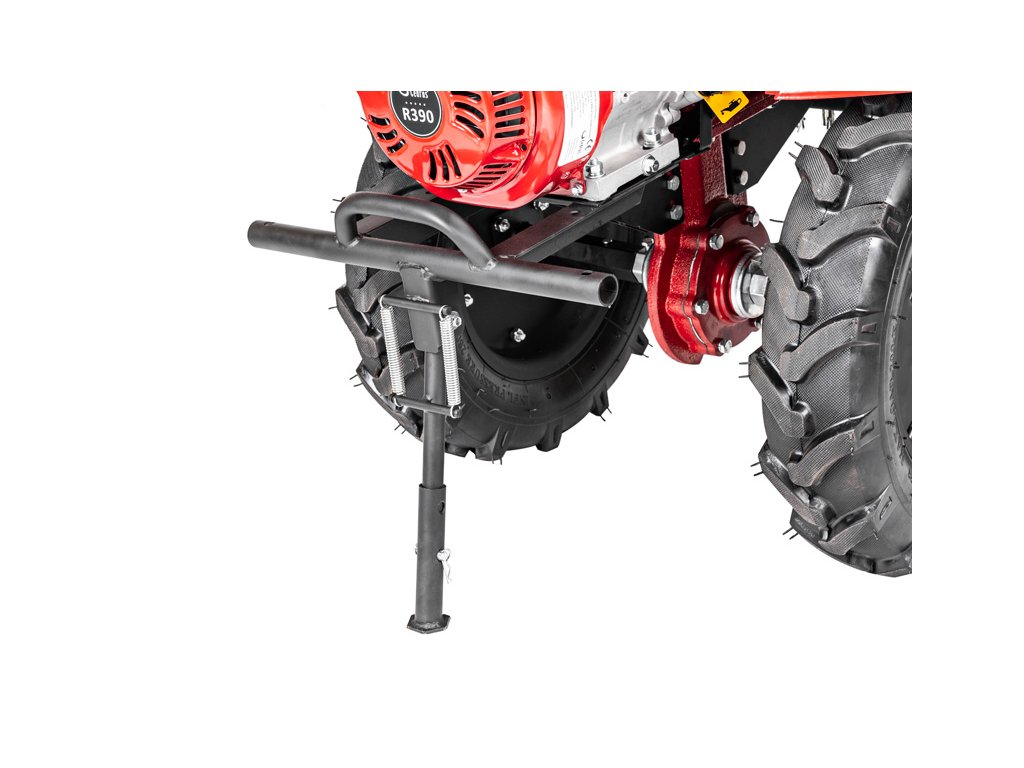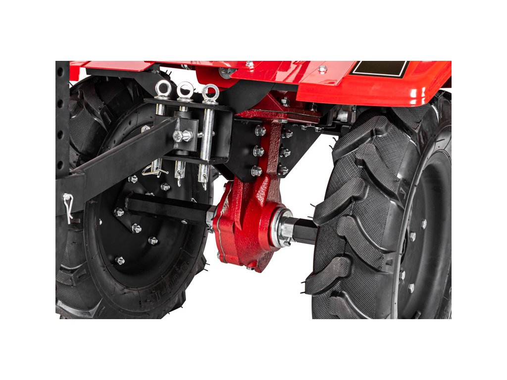 - Díky velkým pneumatikám (5.00x12) s průměrem cca 560 mm je zajištěna stabilita a snadná ovladatelnost. Stroj je konstruován pro spolehlivý provoz, a proto je důležité před použitím naplnit převodovku kvalitním olejem 80W90. Robustní konstrukce a vysoká hmotnost 122 kg zajišťují vynikající pracovní výkon i v náročných podmínkách.