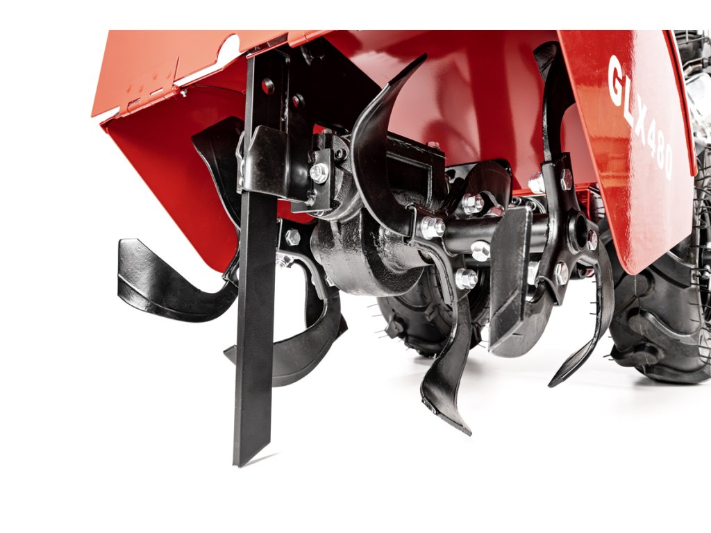 - Kultivátor disponuje dvourychlostní převodovkou (1 rychlost vpřed a zpátečka), což usnadňuje manévrování. Model GLX480F se odlišuje tím, že nože rotují ve směru jízdy, což zajišťuje lepší zpracování půdy a snadnější ovládání.