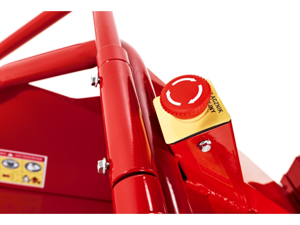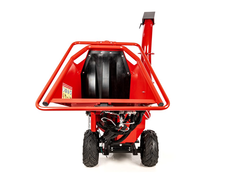 - Drticí jednotku tvoří kombinace 2 nožů na rotoru, 1 kontrnože a 10 rozdrabňovacích ostrí, které efektivně zpracují i větší větve. Maximální průměr zpracovávaného materiálu je 12 cm. Výstupní komín je plně otočný a výškově nastavitelný, což umožňuje snadné řízení směru výhozu.