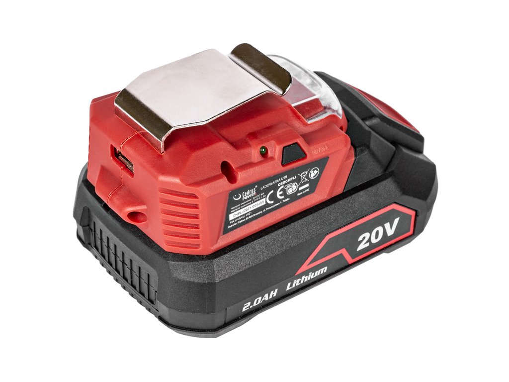 Kompaktní USB nabíječka s LED světlem, určená pro nabíjení zařízení z akumulátoru Cedrus 20 V. Praktická do terénu, dílny i pro nouzové situace.