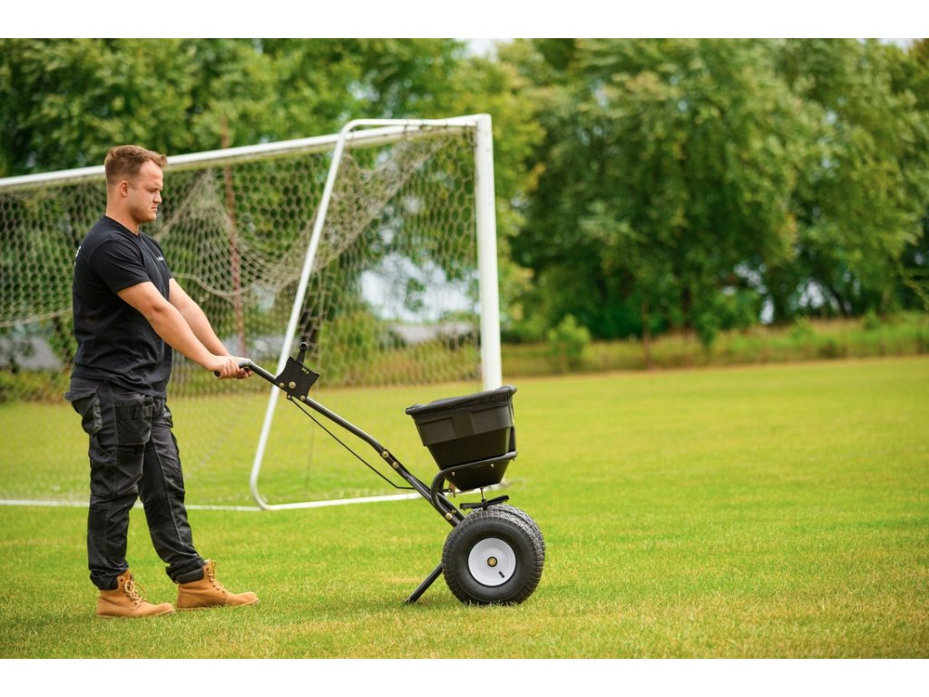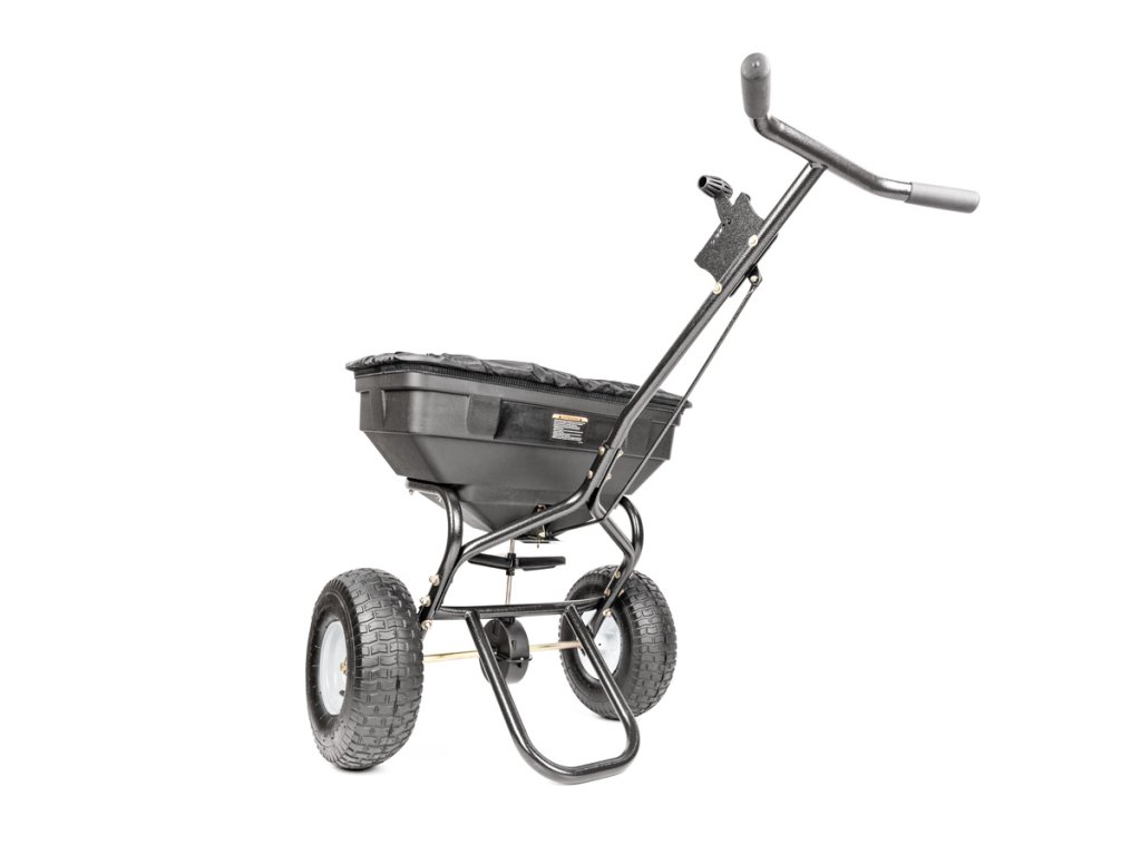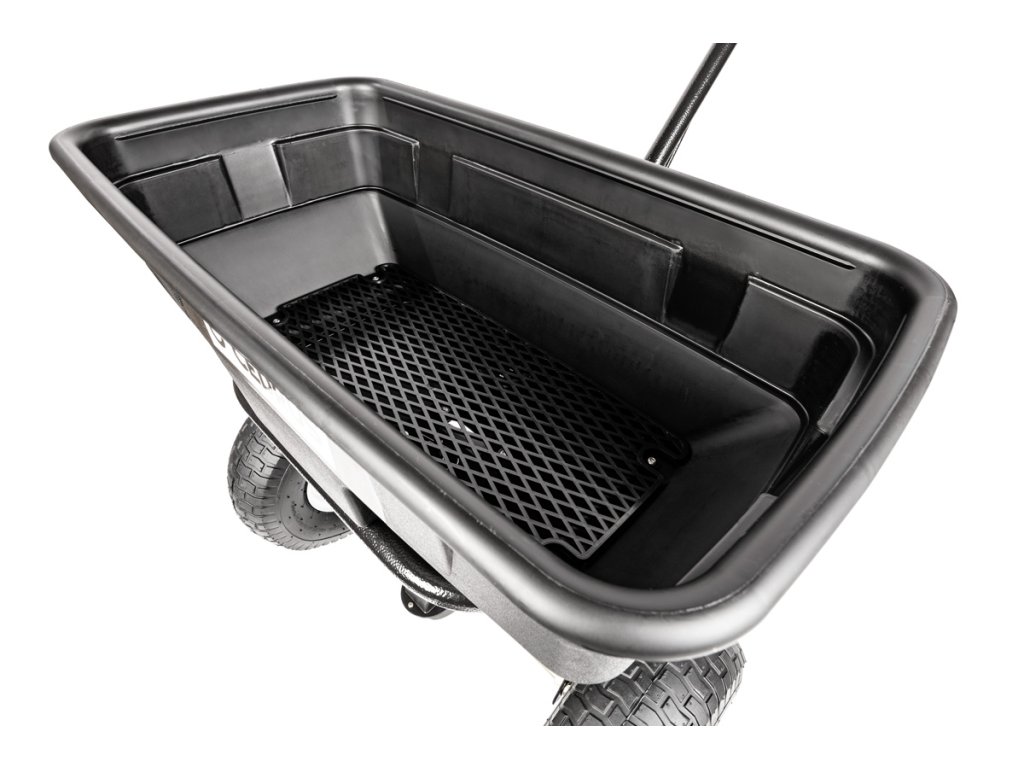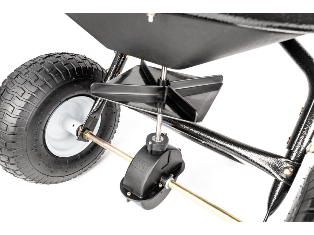 - Zařízení pracuje na rotačním principu s talířem poháněným koly, a dávkování je možné plynule nastavovat pomocí páčky umístěné na madle. Maximální nosnost 56 kg zaručuje dlouhou práci bez nutnosti častého doplňování.