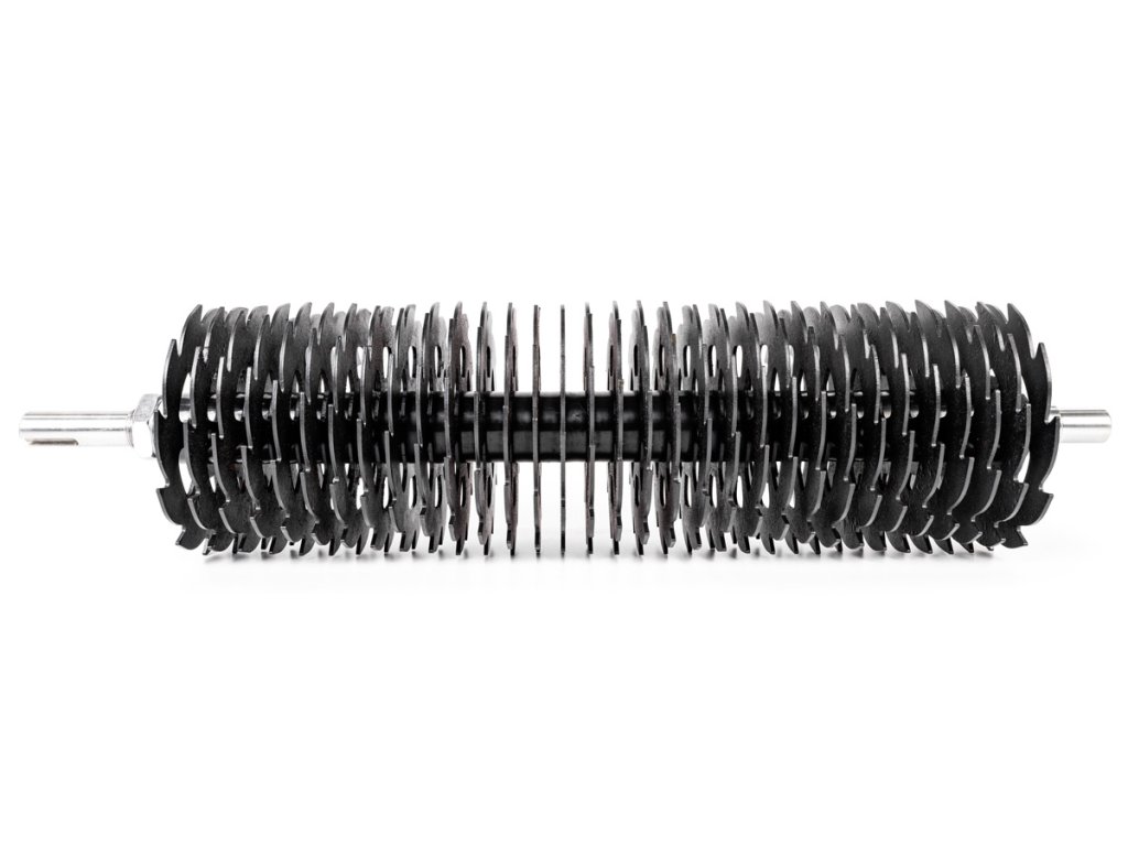 - Válec je osazen 32 ocelovými noži rozmístěnými v pravidelných rozestupech, které zajišťují rovnoměrné a šetrné zpracování povrchu. Tato metoda zabraňuje plstnatění trávníku a napomáhá ke zlepšení výměny plynů a příjmu živin.